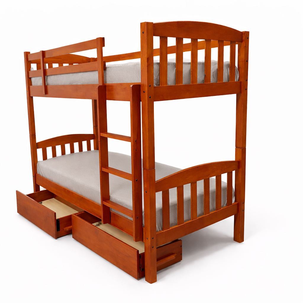 1725mm high solid hardwood single bunk bed with storage drawers, crafted from dense rubberwood for superior strength and durability. Includes freestanding under-bed drawers and two single innerspring mattresses, creating a complete space-saving bedroom solution for New Zealand homes. Strong, stable and suitable for kids, teens and adults. Built to meet NZ/AUS safety standards.