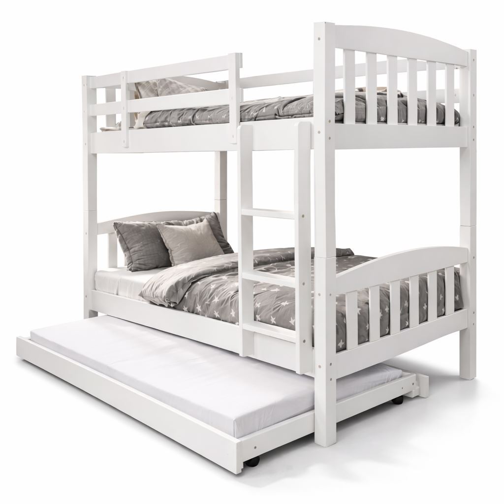 Each sleeping level supports a maximum recommended user weight of 100kg (user weight only; mattress weight already accounted for), and the freestanding trundle supports a maximum recommended user weight of 80kg (user weight only), with weight to be evenly distributed under normal residential use; excessive point loading, jumping, misuse, or uneven weight distribution may reduce product lifespan.
